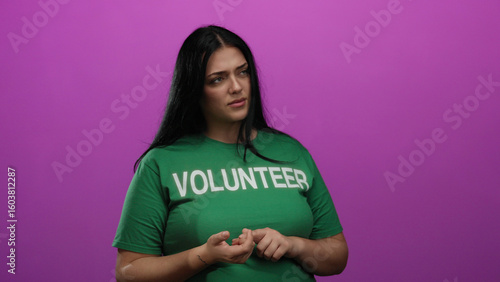 Woman volunteer wearing green shirt stands against vibrant pink backdrop expressing contemplation and engagement in community support roles highlighting diversity and empowerment