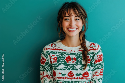 Woman wearing a Christmas sweater, smiling next to a beautifully decorated tree with colorful ornaments and twinkling lights shining in the background.