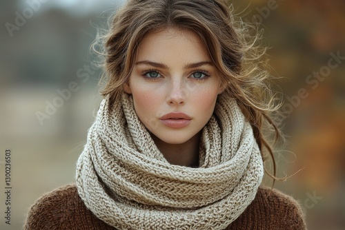 Woman wearing a knitted scarf against a soft autumn backdrop