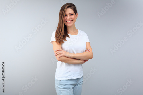 Woman wearing white t shirt with copy space standing with crossed arms.