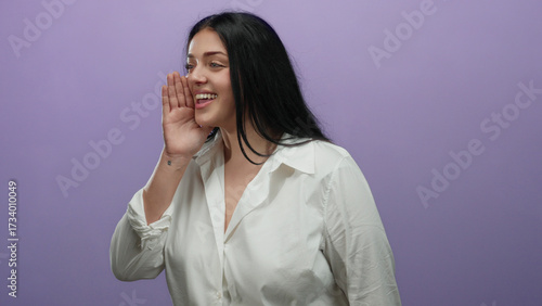 Woman whispering with hand near mouth against a purple background in a studio setting, wearing white shirt, showcasing plus, size, curvy, style, fashion, isolated, smiling, confident.