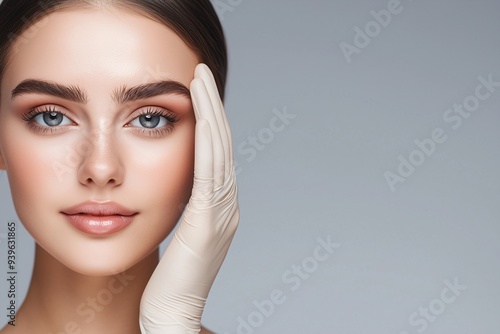 woman with a beautiful face and smooth skin is having a facial cosmetic check-up by a professional doctor in white gloves, for clinic and cosmetology service, beauty concept poster, banner