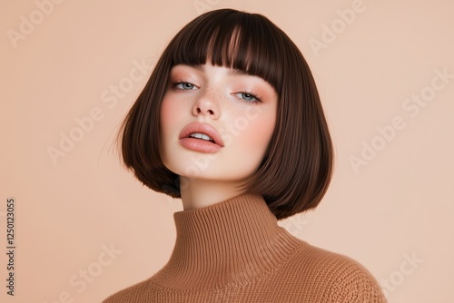 Woman with a bob haircut wearing a soft brown sweater against a solid background