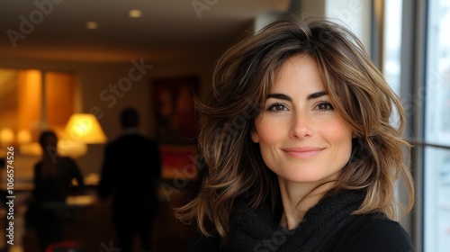 Woman with a soft smile in a cozy indoor setting, warm lighting, blurred background with figures, soft hairstyle, and casual black attire.