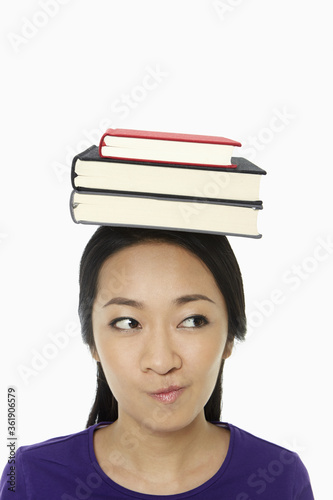 Woman with a stack of books on her head