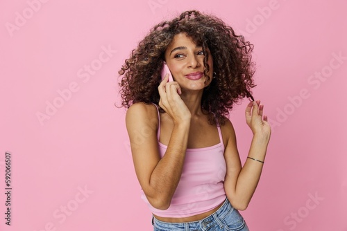 Woman with curly afro hair talking on phone in pink top and jeans on pink background, smile, happiness, copy space