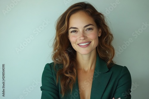 Woman with curly hair smiles confidently while wearing a green blazer indoors against a neutral background