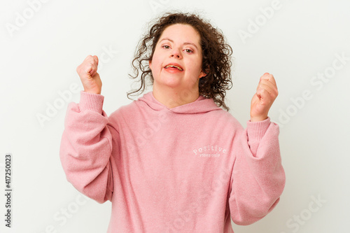 Woman with Down syndrome isolated cheering carefree and excited. Victory concept.