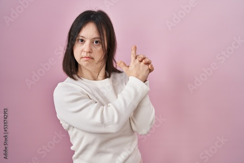 Woman with down syndrome standing over pink background holding symbolic gun with hand gesture, playing killing shooting weapons, angry face