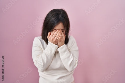 Woman with down syndrome standing over pink background rubbing eyes for fatigue and headache, sleepy and tired expression. vision problem