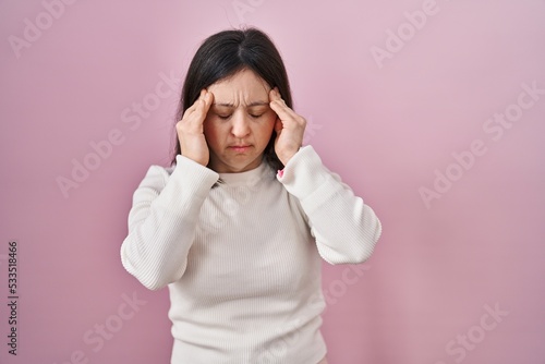 Woman with down syndrome standing over pink background with hand on head, headache because stress. suffering migraine.