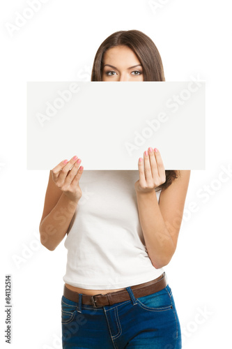 Woman with face covering by signboard or placard, with copyspace