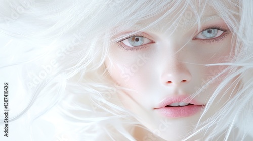 Woman with flowing white hair ethereal style, high-key soft lighting, close-up portrait view, delicate skin texture, serene expression, white background, cool pale tones, ideal for fantasy art