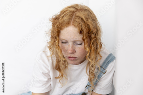 Woman with ginger hair looking down