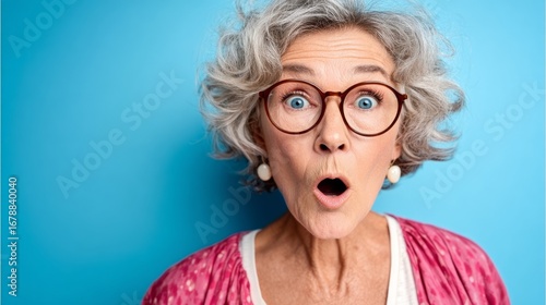 Woman with glasses and a surprised expression on her face. She is wearing a pink shirt. Concept of surprise and curiosity