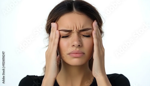 Woman with headache, isolated on white background. Female holding her head in pain, showing discomfort or stress. Concept of health issues, tension, migraine, or fatigue