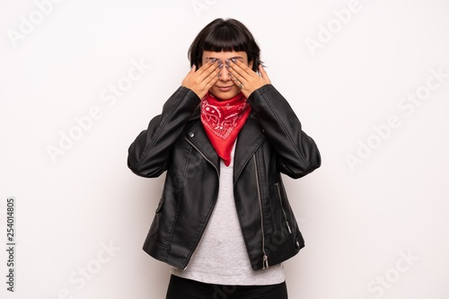 Woman with leather jacket and handkerchief covering eyes by hands. Do not want to see something