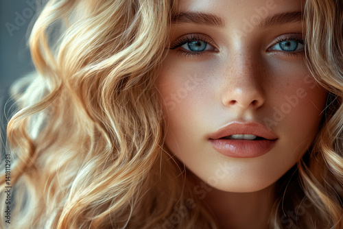 Woman with long blonde hair and blue eyes smiling as she walks through a sunny park, surrounded by colorful spring flowers and vibrant greenery.
