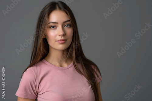 Woman with long brown hair and a pink shirt is smiling for the camera