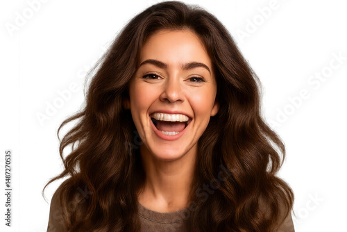 Woman with long brown hair, wearing a casual outfit, standing confidently with a warm smile, isolated on transparent background.