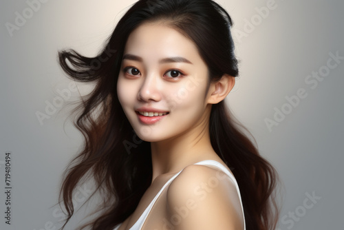 Woman with long brown hair wearing white tank top