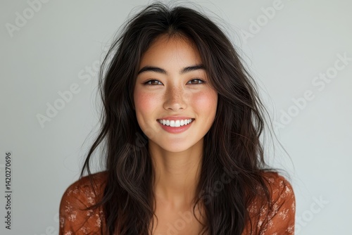 Woman with long dark hair smiles warmly while wearing a cozy sweater against a neutral background in natural light, creating a calm and inviting atmosphere