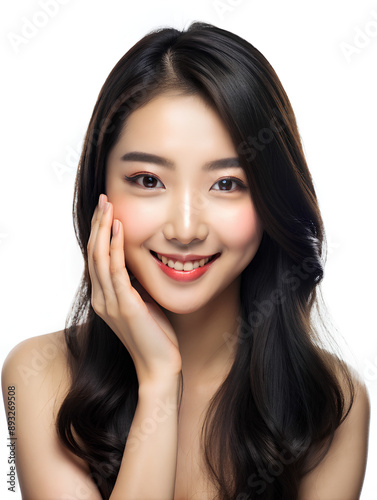 Woman with long dark hair smiling gently, her hand resting near her face with clean and fresh skin isolated on white background, Face care