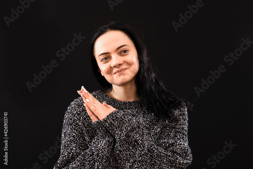 woman with long hair wearing gray sweater on a black background gesticulating with her hands