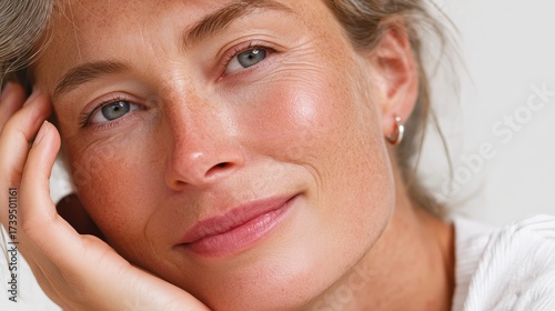 Woman with natural beauty smiling softly while resting her chin on her hand in a neutral background during daylight