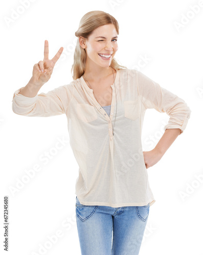 Woman with peace sign, wink and portrait isolated on transparent png background with fun emoji. Happiness, smile and face of student girl with v hand gesture in agreement, yes and positive opinion.