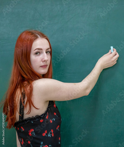 Woman with red hair is writing on a green chalkboard