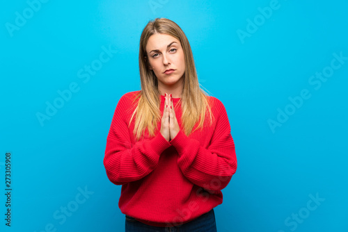 Woman with red sweater over blue wall keeps palm together. Person asks for something