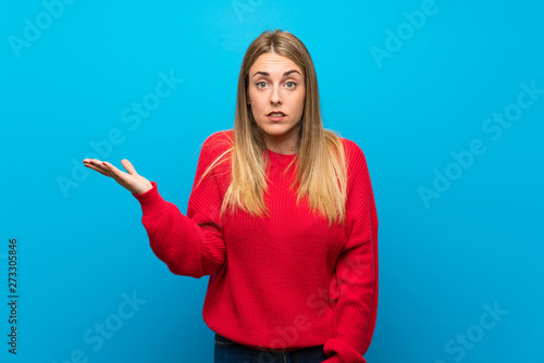 Woman with red sweater over blue wall making doubts gesture