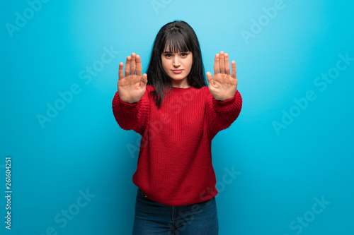 Woman with red sweater over blue wall making stop gesture and disappointed