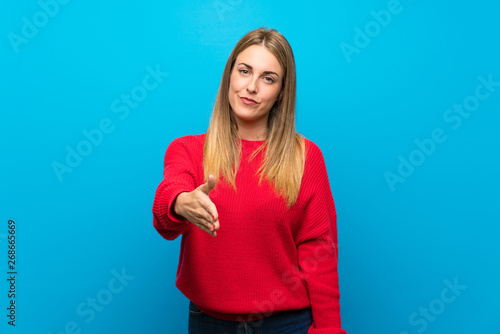 Woman with red sweater over blue wall shaking hands for closing a good deal