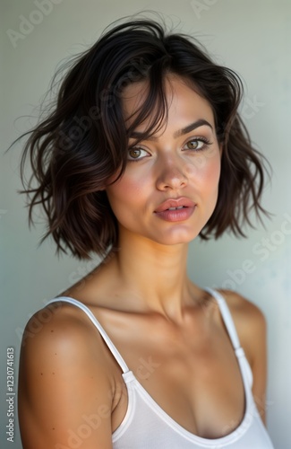 Woman with short brown hair, natural makeup. Fashionable bob haircut. Beautiful, healthy-looking skin. Studio portrait in fashion look. Natural light highlights features. Perfect for beauty salons,