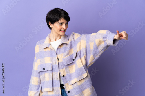 Woman with short hair isolated on purple background giving a thumbs up gesture
