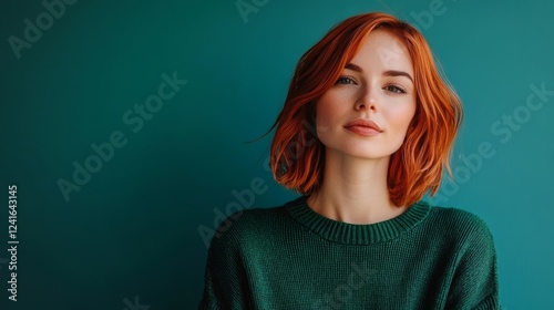 Woman with short red hair wearing a green sweater poses against a teal background, exuding confidence and style