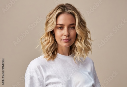 woman with shoulder-length blonde hair posing against a light brown backdrop, She wears a white t-shirt and her gaze is directed off to the side