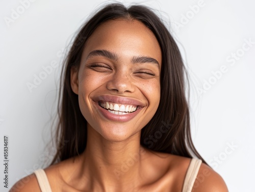 woman with shoulderlength straight hair, smiling and looking at the camera. She is wearing a beige strapless top against a white background