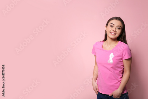 Woman with silk ribbon and space for text on color background. Breast cancer awareness concept