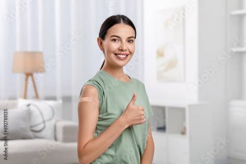 Woman with sticking plaster on arm after vaccination showing thumbs up at home