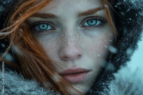 Woman with striking blue eyes and red hair in a snowy winter landscape surrounded by falling snowflakes