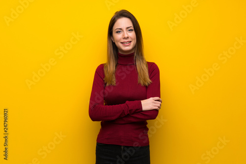 Woman with turtleneck over yellow wall keeping the arms crossed in frontal position