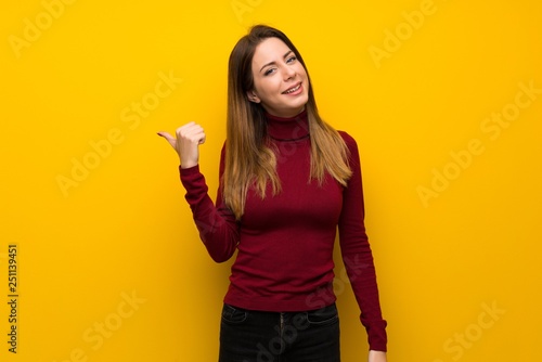 Woman with turtleneck over yellow wall pointing to the side to present a product