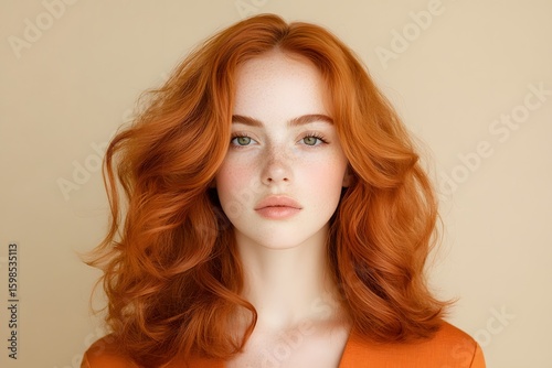 Woman with voluminous red wavy hair and fair skin, Studio portrait on beige background, Fashion beauty shot, Minimalist clean style, Copy space for text