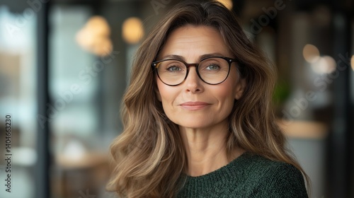 Woman with wavy brown hair and glasses wearing a green sweater, softly lit indoor background