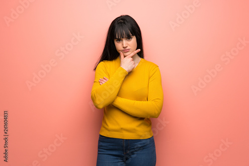 Woman with yellow sweater over pink wall thinking