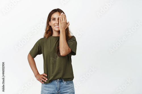 Women skin care. Adult woman with no makeup, healthy facial skin and shiny hair, smiling white teeth, cover half of face one eye and looking at camera happy, white background