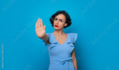 Women's rights. Feminism. Equality of gender. Serious strong conceptual woman feminist shows stop gesture on camera. International womens day
